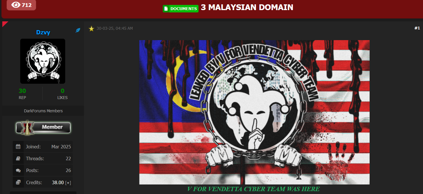 The V for Vendetta Cyber Team has targeted the Malaysian Education, Manufacturing, and Legal Services industries. Leaked domains include:
