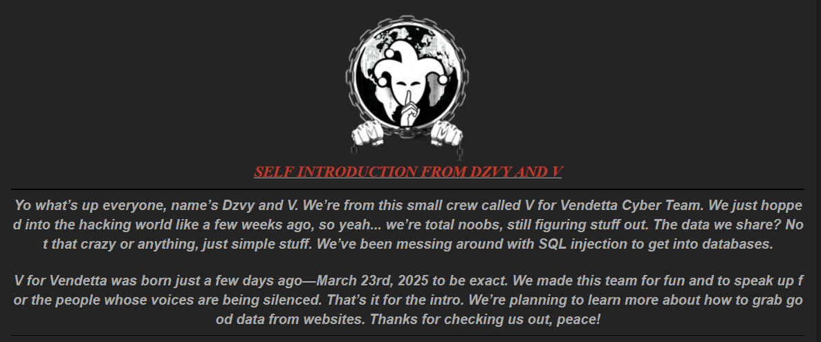 A newly threat actor, operating under the alias “V FOR VENDETTA CYBER TEAM,” has claimed responsibility for cyber-attacks on 10 high-profile Indian websites, resulting in the unauthorized disclosure of sensitive information. Active since March 23, 2025, the group has associated the attacks with socio-political messaging, alleging motivations related to anti-corruption and the representation of marginalized voices.