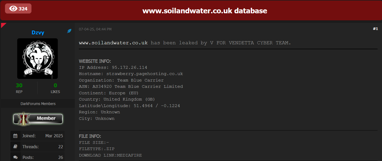 Recently, the V FOR VENDETTA CYBER TEAM leaked the United Kingdom's Soil and Water [ www.soilandwater.co.uk ] domain on a forum.