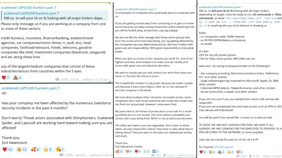 Narrative control and recruitment: Beyond pure intrusion, the actors use public channels to shape expectations: after high-profile events (e.g., CrowdStrike), they posted denials/clarifications aimed at minimizing forensic attribution while simultaneously using the publicity to recruit insiders. This is a deliberate method: by controlling the story they reduce investigatory clarity and increase the perceived value of insider partnerships, turning press attention into an asset for scaling future operations.