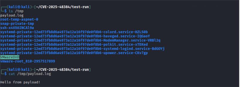 After the clone operation completed, a malicious post-checkout hook was executed, which created a file in the /tmp directory (/tmp/payload.log) containing the message “Hello from payload!”. This validated that the exploit successfully achieved arbitrary file write and code execution outside the repository directory.