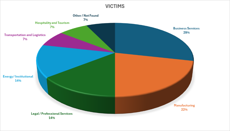 The victim set spans multiple industries, with Business Services accounting for approximately 29% of observed victims, followed by Manufacturing at around 22%. Legal / Professional Services and Energy / Institutional sectors each represent roughly 14%, indicating notable exposure within data-intensive and regulated environments. Additional sectors include Transportation and Logistics and Hospitality and Tourism, each contributing about 7%, along with a small proportion of cases where sector attribution is not clearly defined.