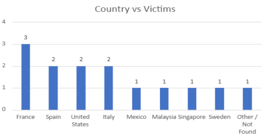 The victim distribution reflects a multi-region presence across Europe, North America, and Asia-Pacific. The highest concentration is observed in France, followed by Spain, the United States of America, and Italy, indicating a stronger clustering across European and North American regions.