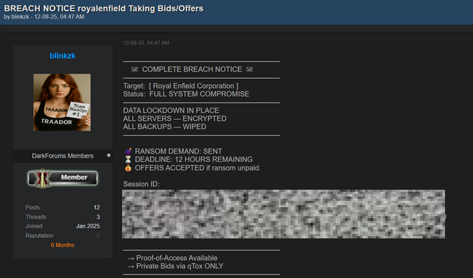 On 12th Aug’25, an undisclosed threat actor operating under the name “blinkzk” has published 2 back to back auction posts at the dark-forum about the complete breach of Royal Enfield (an Indian automotive company) and Nevada Department of Motor Vehicles (US based government automotive organization) respectively. Following are the redacted posts from the dark forum: