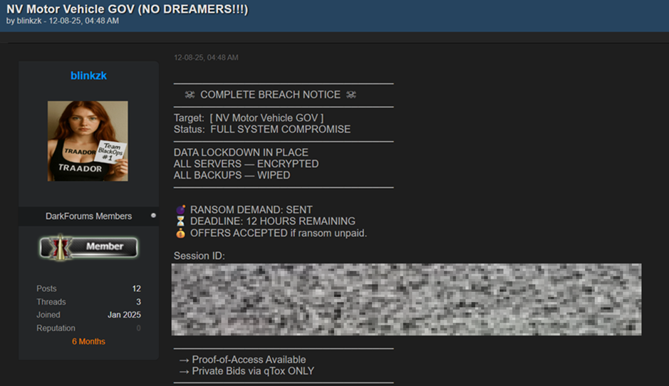A threat actor operating under the alias "blinkzk" claimed responsibility for significant cyberattacks against two automotive manufacturing organizations — Royal Enfield and the Nevada Department of Motor Vehicles — reportedly becoming the perpetrator of a large-scale ransomware attack. The threat actor claimed to have encrypted all servers, deleted all backups, and set a 12-hour ransom ultimatum, threatening to auction the stolen data to third parties.